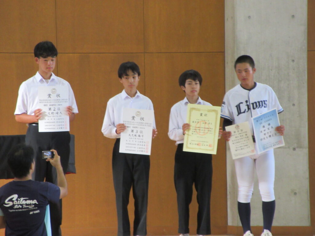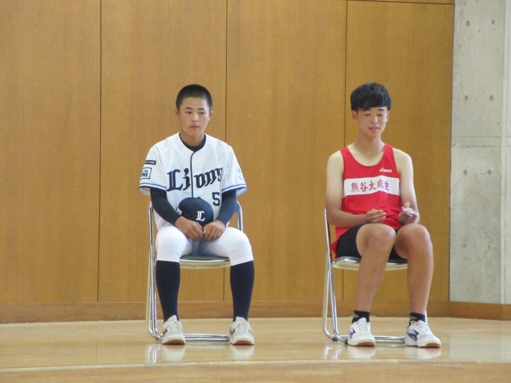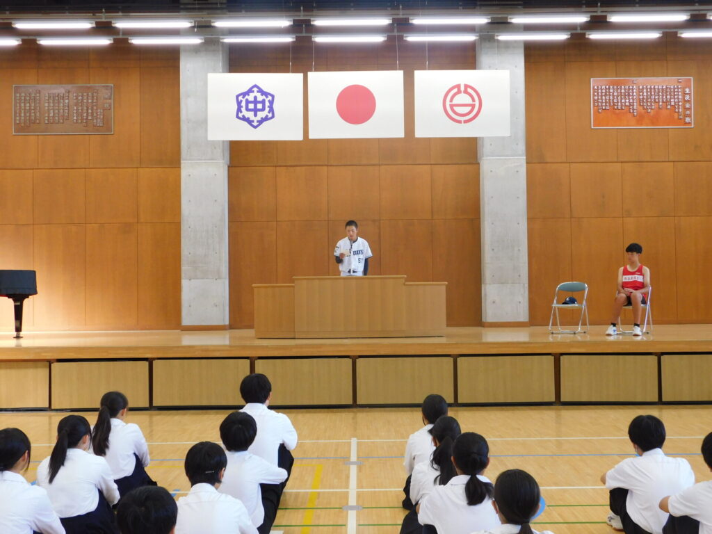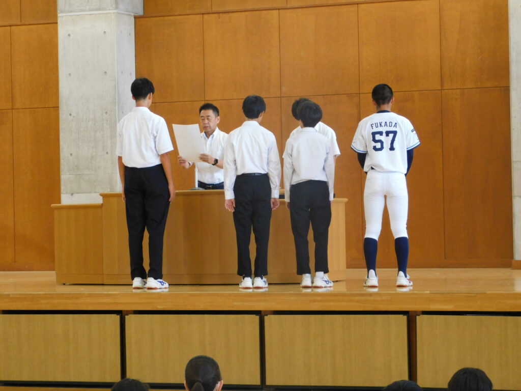 全校朝会で新人陸上・空手・野球の生徒の表彰を行いました。その後、部長会のメンバーで埼玉西武ライオンズジュニアユースとして関東大会に出場する生徒、陸上競技男子3000mで県大会に出場する生徒の壮行会を行い、学校全体で選手に力強いエールを送りました。出場する選手の皆さん、『本気・根気・元気』で頑張ってください。