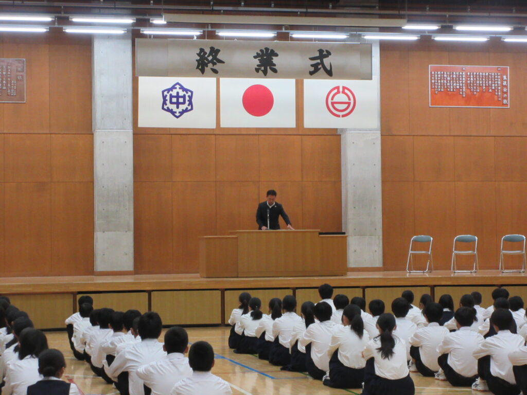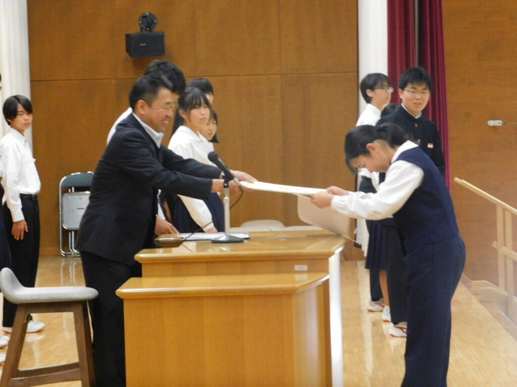 本日、前期終業式を行いました。各学年代表の生徒4名の前期を振り返っての発表では、一人ひとりが的確に自らの生活を振り返るとともに、後期に向けてステップアップできる目標を述べることができました。校長講話では、「大麻生中学校の生活スローガンでもある「時。場・礼」を身につけ、人から信頼され、信頼を受ける人になってください。」との内容でした。終業式後には表彰も行われ、多くの生徒が登壇しました。前期も活躍や笑顔をたくさん見せてくれた麻中生、ありがとう!!