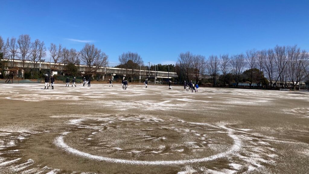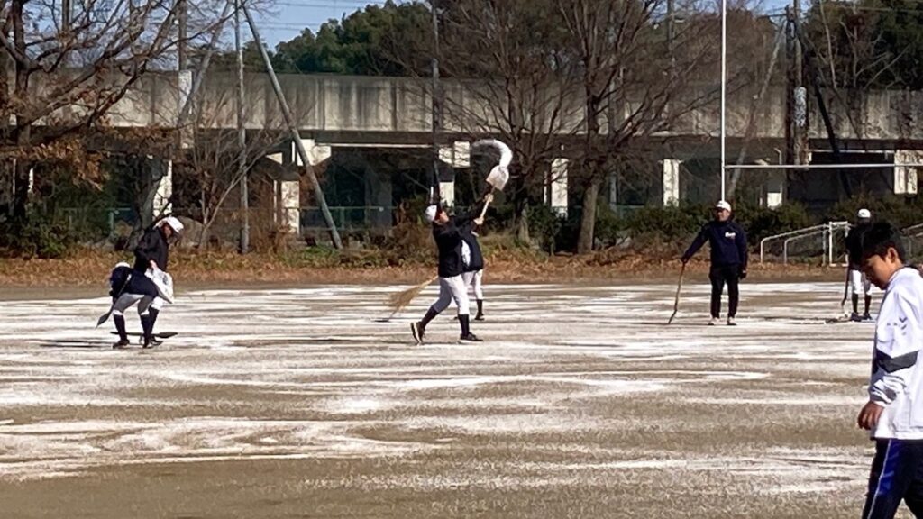部活動終了後、各部活動では練習に加え、部室や練習場所など日頃利用している活動場所の清掃やグランドに凍結防止のために塩化カルシウムを散布し年末の部活動最終日を締めくくりました。