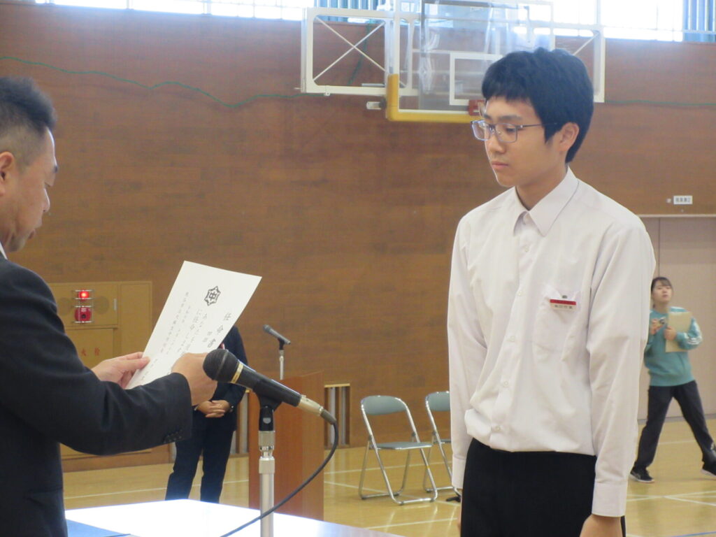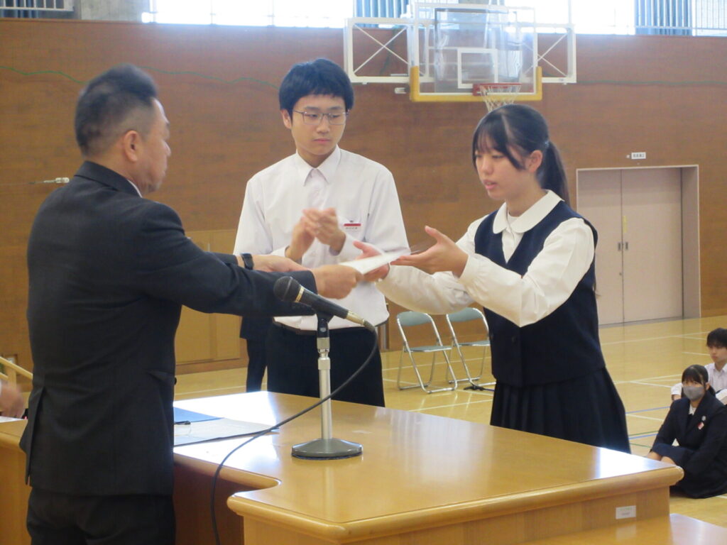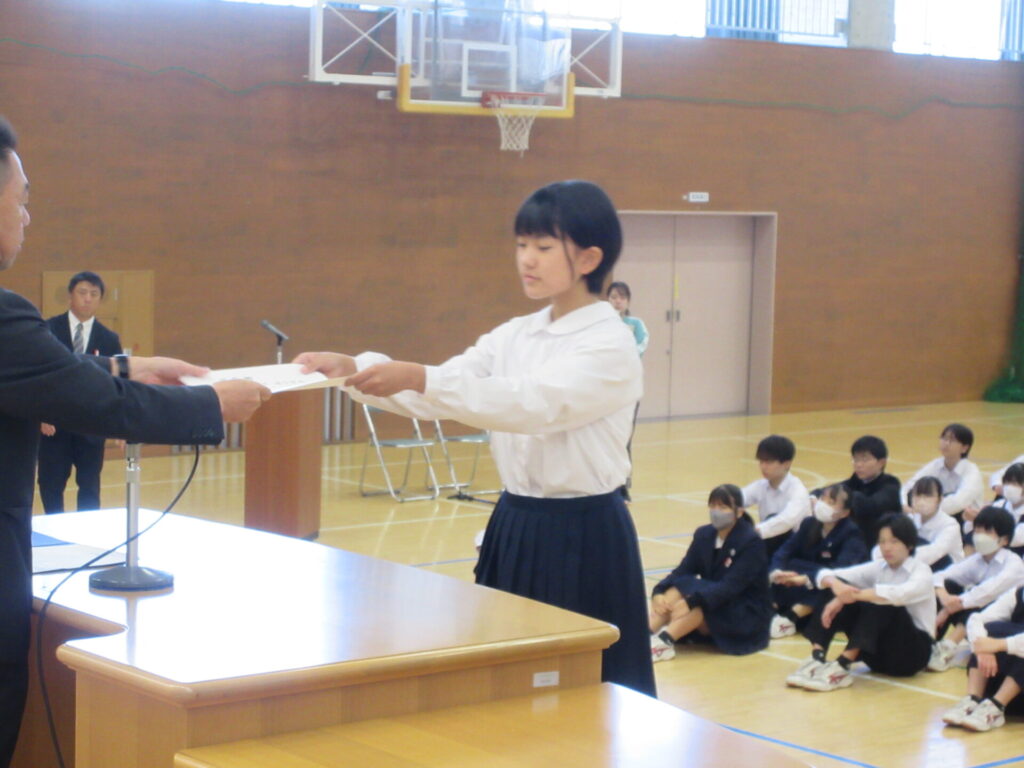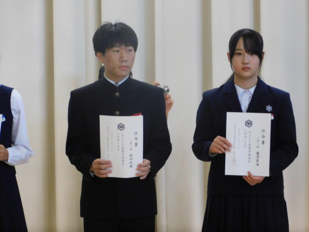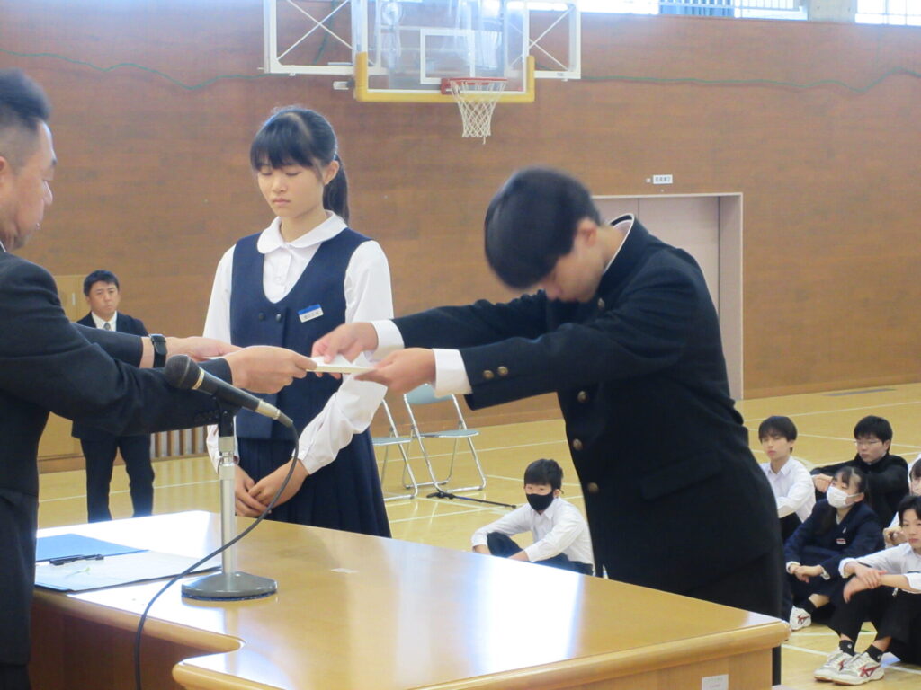 後期学級委員任命式を行いました。各クラスの代表の生徒が、校長先生から任命書を受け取りました。緊張した面持ちで任命書を受け取る姿が見られました。