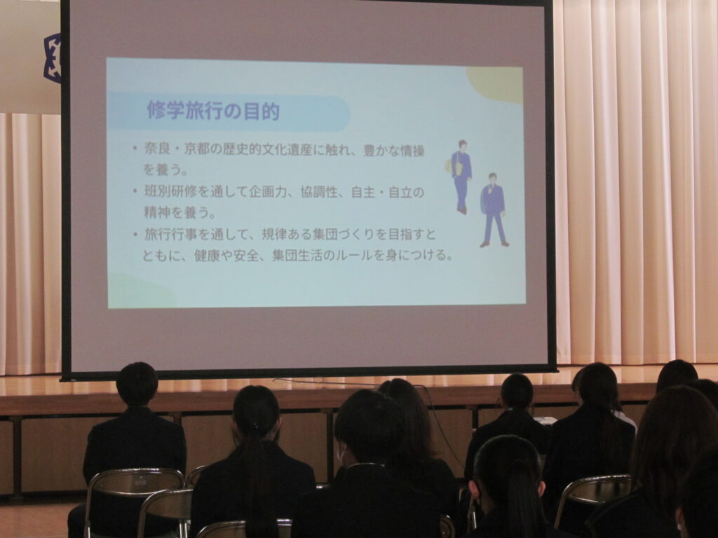 1・2年生の教室では、少し緊張しながらも一生懸命に課題に取り組む生徒たちの姿が見られました。懇談会では、ご家庭での様子を伺うことができ、担任一同、大変有意義な時間を過ごさせていただきました。3年生の修学旅行説明会では、実行委員の生徒たちの堂々とした発表が見られました。