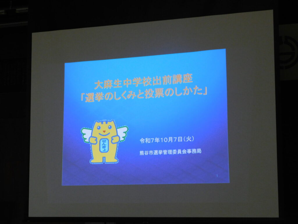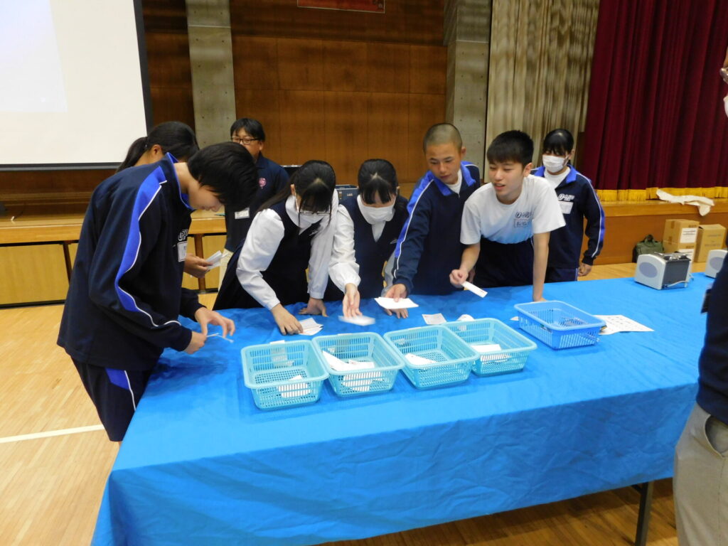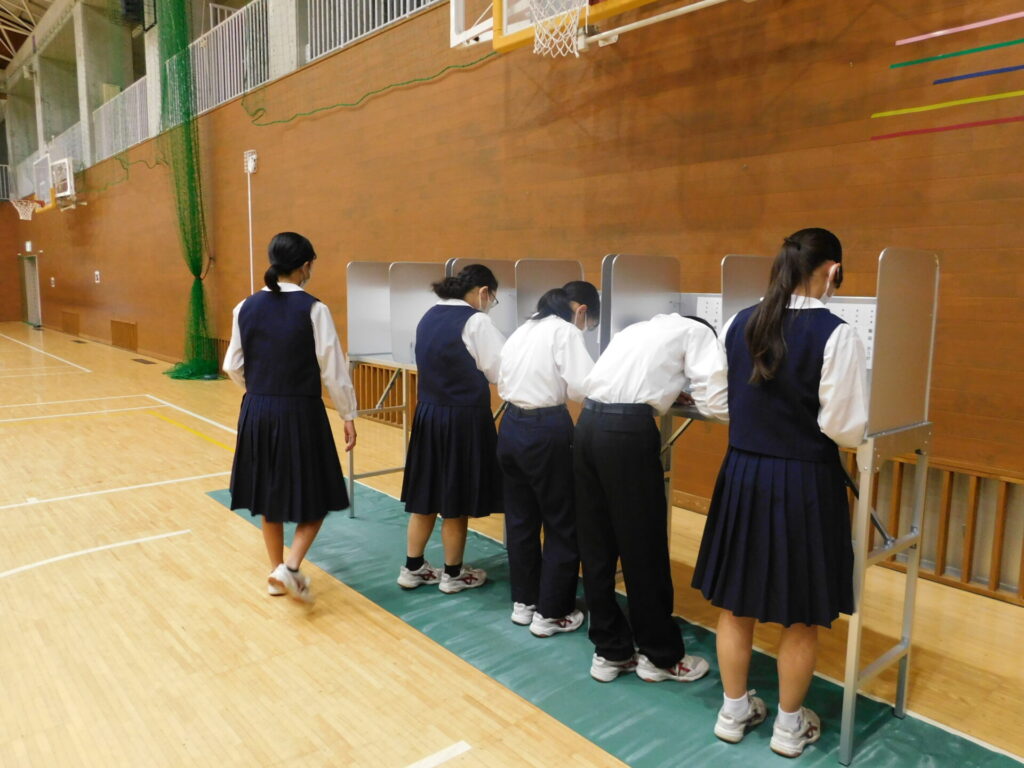 選挙のしくみや選挙管理委員会の役割について説明を受け、その後に模擬投票を体験しました。模擬選挙では、「大麻生市 市長選挙」をテーマに4人の候補者の演説を聞き、投票先を考えました。生徒一人ひとりが、自分の考えをもとに判断する貴重な時間となりました。投票には、実際の選挙で使用されている投票用紙や記載台、投票箱を用い、生徒たちは経験に戸惑いながらも真剣に投票していました。今回の学習を、今月行う生徒会選挙や選挙権を得た際にぜひ活かしてほしいと思います。