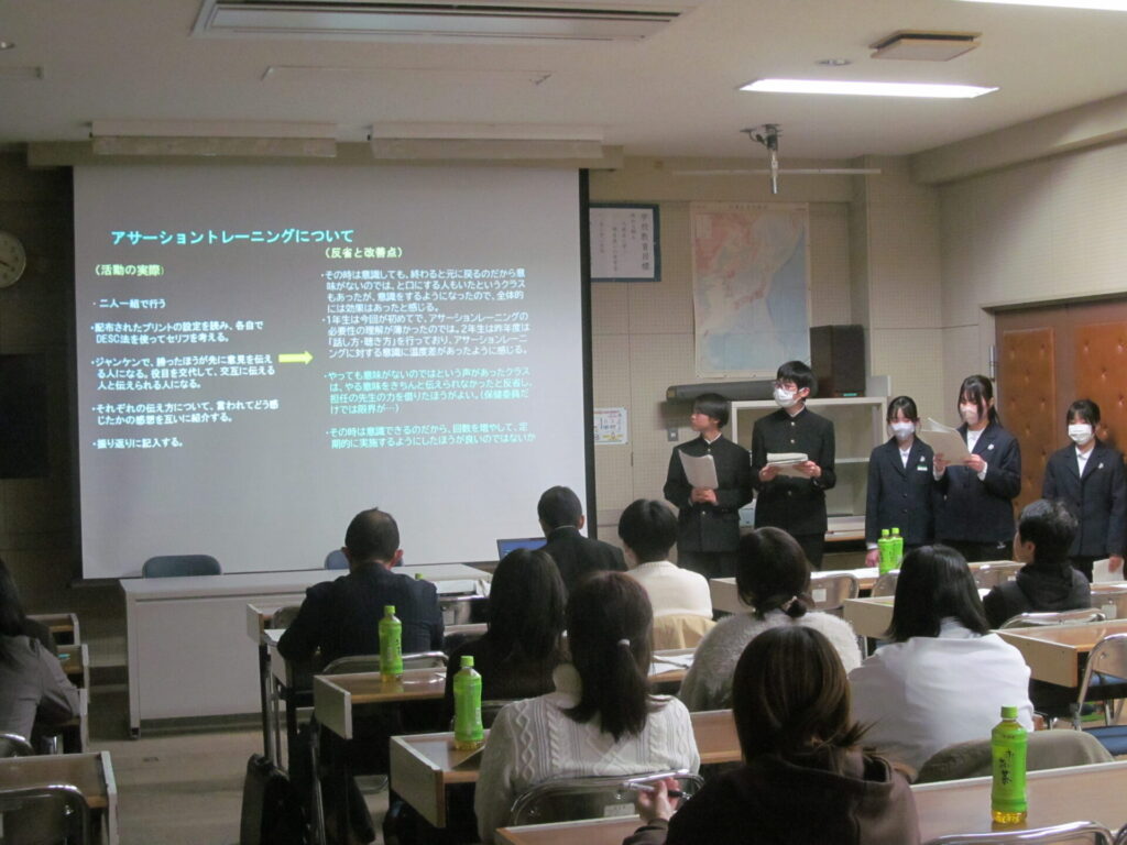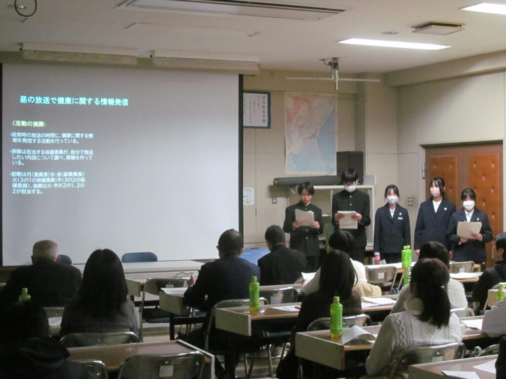 本日、新島整形外科院長 新島 光宏 先生、学校薬剤師 牛島 裕陽 先生に来校いただき、第2回学校保健委員会を開催しました。1・2年生の生徒会保健委員会さんによる1年間の保健委員会の取り組みを発表しました。ご指導いただいた新島先生からは「肥満と肥満症」について、学校薬剤師の牛島先生からは「くすりの過剰摂取による影響」についての情報提供をしていただきました。成長期にある中学生の保護者の皆様には有意義な時間となりました。アドバイスいただいたことを生かし、本校の保健活動をさらに推進してまいります。