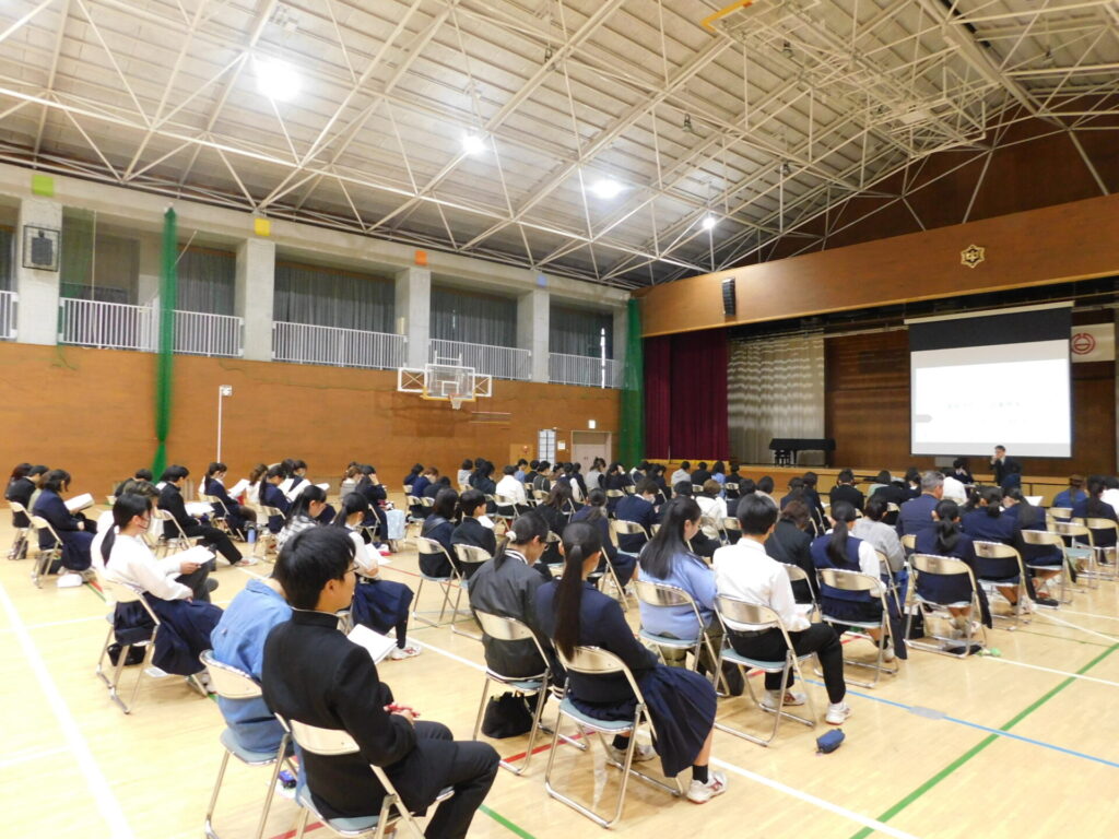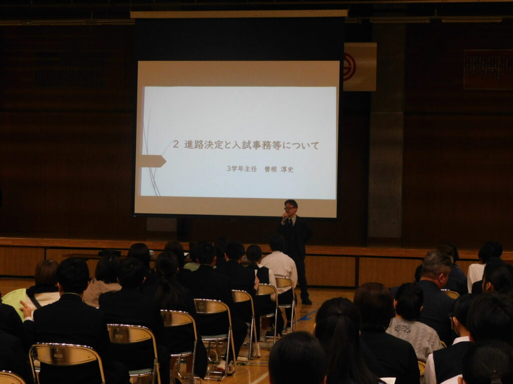 いよいよ出願の時期を目前に控え、生徒たちが安心して進路を選択できるよう「進路説明会」を実施しました。説明会は、保護者だけではなく3年生の生徒も参加し、進路選択に向けての心構えや就職・進学決定までの流れ、公立高校の受検、私立高校の受験の流れや注意点、奨学金の制度等について説明がありました。自分の将来の夢に向けて、真剣に考え、挑戦してくれることでしょう。