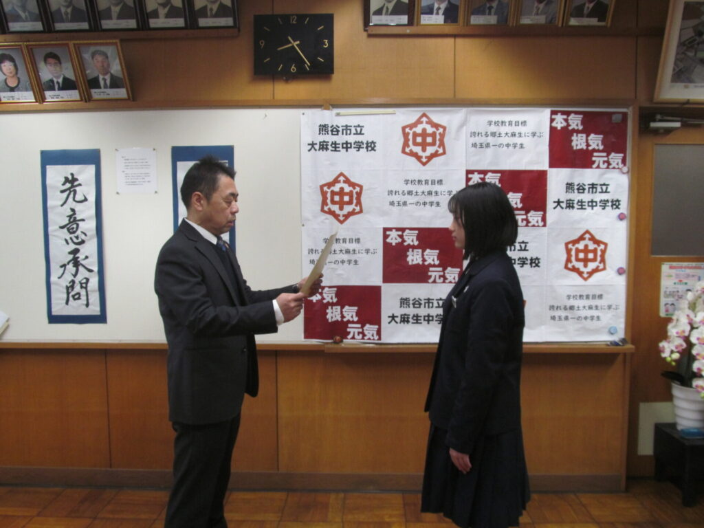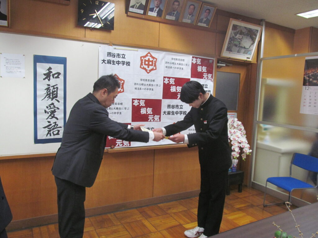今朝は校長室にて表彰を行い、オンラインで各教室に配信しました。