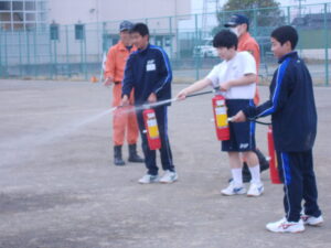 訓練の最初に、避難の様子や消火器の使い方などをお話いただき、後半に各学年の代表生徒や先生方による水消火器を実際に使って消火練習をしました。避難行動や消火訓練に対し、生徒たち貴重な体験に真剣かつ意欲的に取り組んでいました。