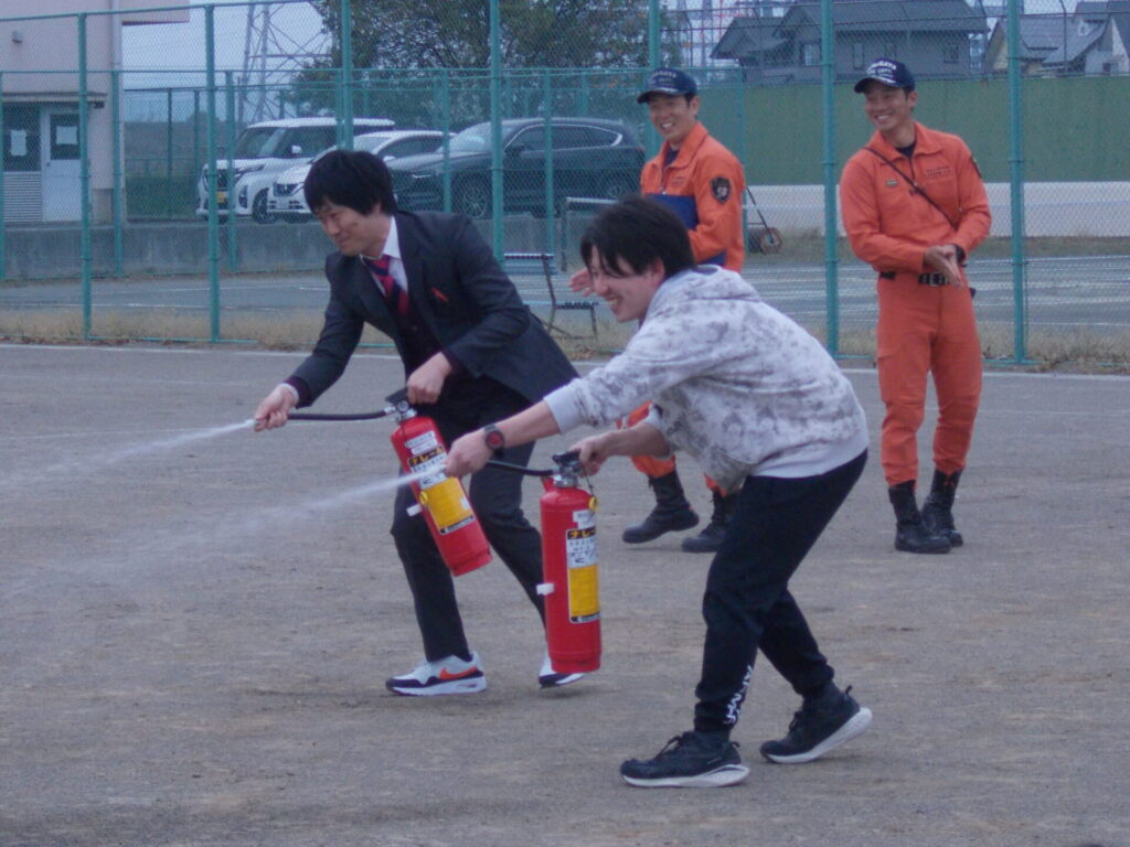 午後に防災訓練を行いました。防災訓練には熊谷消防署より消防士の方々に来校していいただき、防災に関する話や水消火器を使用した実技のご指導をしていただきました。