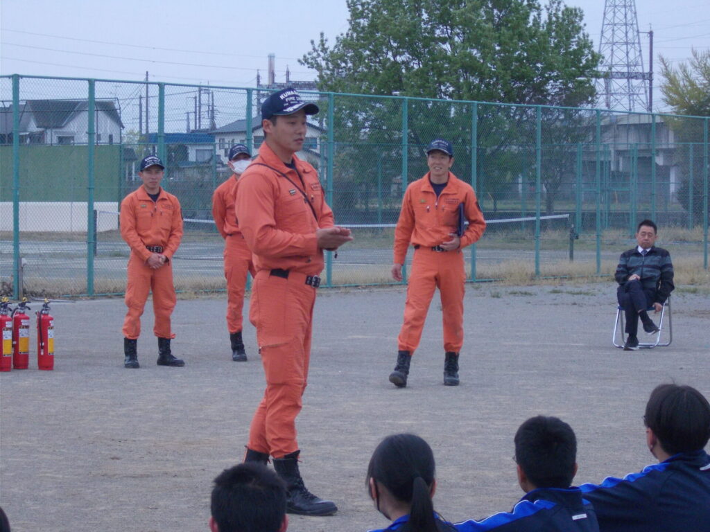 最後に、在学中に陸上競技で全国大会に出場された本校卒業生の消防士さんも来校されていたため、激励を兼ねてお話をいただきました。日頃できない貴重な体験やお話により、防災意識がさらに高まる時間となりました。