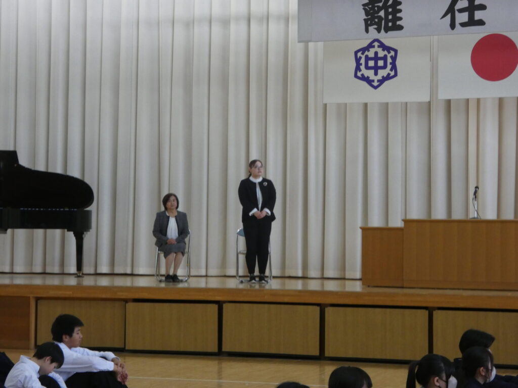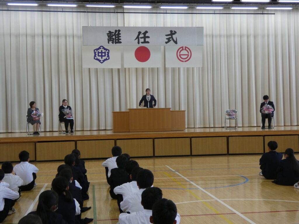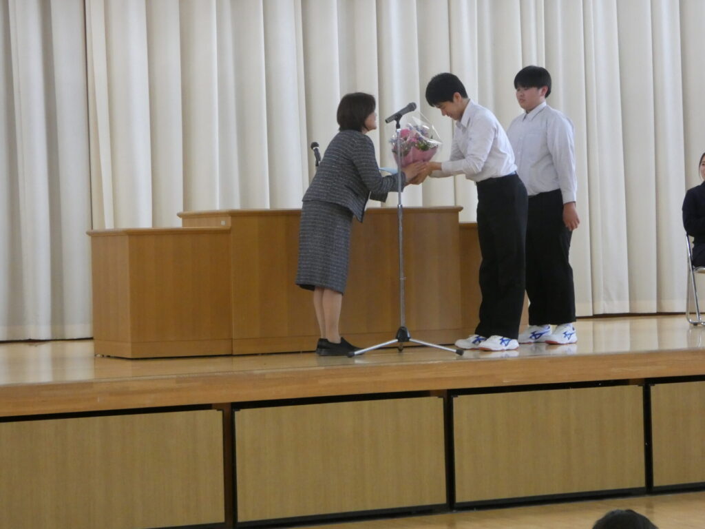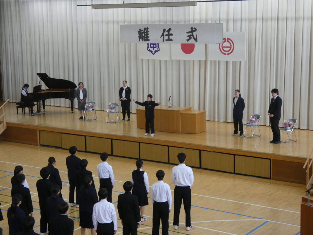 代表の生徒から、先生方にお礼の手紙と花束を贈呈し、先生方からは生徒へメッセージをいただきました。心温まる素晴らしい離任式となりました。転出された先生方、これまでのご指導、本当にありがとうございました。それぞれの場でのさらなるご活躍を心よりお祈りしております。